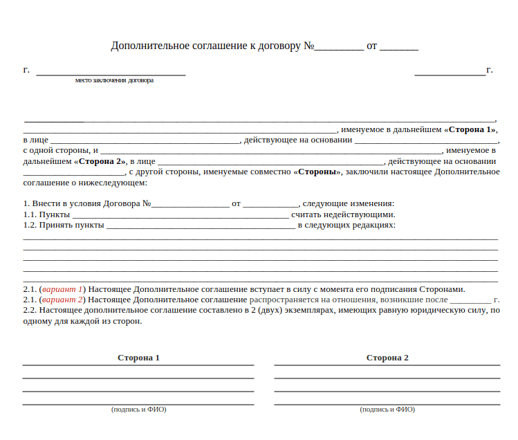 Дополнительное соглашение – это документ, который вносит изменения или дополнения в уже действующий договор. Оно позволяет сторонам скорректировать условия без необходимости расторгать первоначальный договор или заключать новый. Важно не запутаться в документах, допсоглашение может быть составлено и на изначальный договор и на уже имеющиеся соглашения и вводить, отменять или изменять практически любые пункты. Допсоглашение может быть оформлено к любому типу договора: купли-продажи, аренды, оказания услуг, трудовому договору, договору подряда и т.д. В спорных случаях лучше проконсультироваться с юристом, чтобы избежать рисков признания изменений недействительными. Часто при участии юр. лиц проще оформить дополнительное соглашение вместо нового договора, чтобы сохранить прежние обязательства и гарантии, а также чтобы не переделывать прежнюю документацию, например акты, другие допсоглашения, гарантийные письма, обязательства по авансам, залогам, неустойкам, штрафам и т. д. Ещё существуют
