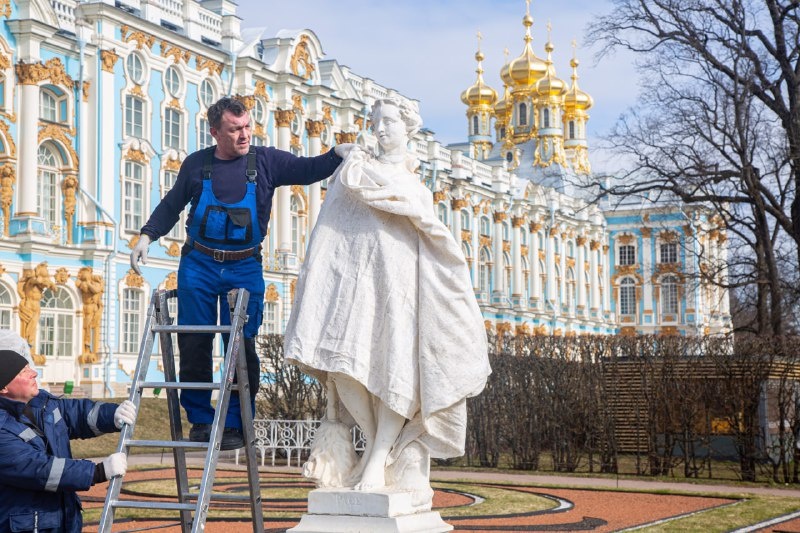 Скульптуры «Царского Села» освободили от зимних футляров. Первыми раскрыли фигуры у Екатерининского дворца и на Эрмитажной аллее. На очереди — статуи на террасе Руска, в Собственном и Фрейлинском садиках, знаменитая Девушка с кувшином и другие. Это самая радостная работа. Наши греческие герои, аллегории, нимфы и мифологические существа снова вместе и готовы вызывать восхищение посетителей, — поделилась Наталья Лансере, хранитель скульптуры ГМЗ «Царское Село». Фото: ГМЗ «Царское село» Подпишись на Город+