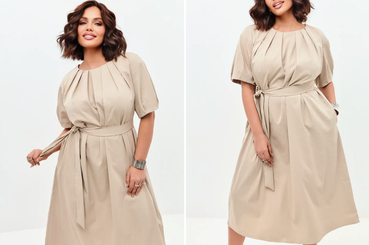 Это платье — тот самый случай, когда комфорт и элегантность идут рука об руку. Мягкая ткань красиво струится по фигуре, не подчёркивая то, что не нужно, а создавая женственный силуэт. Аккуратные складки у горловины придают образу изысканности, а пояс помогает сделать акцент на талии — или оставить свободный силуэт, если хочется больше свободы.