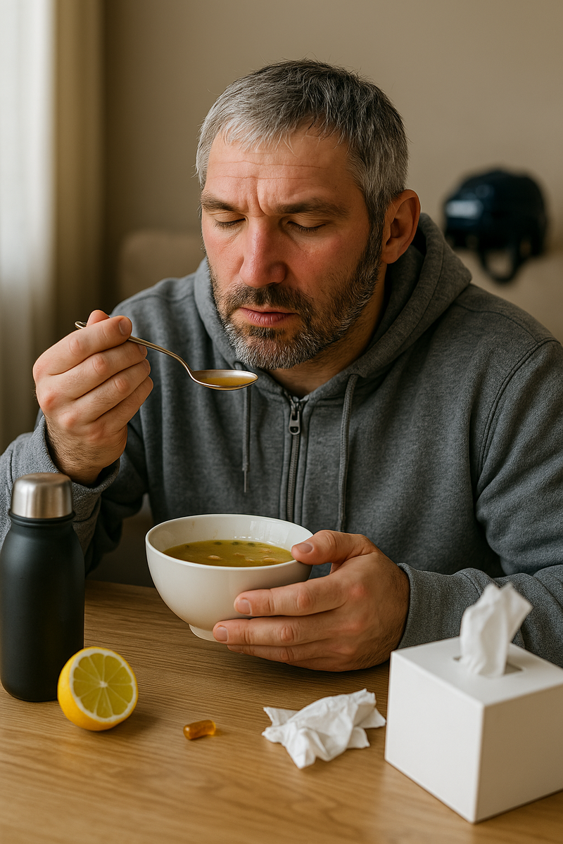 Когда болеешь, важно не «наесться», а дать организму питание, которое он сможет использовать без перегрузки. Белок — чтобы строить клетки. Омега-3 — чтобы снизить воспаление. Тепло и жидкости — чтобы не высыхали слизистые!