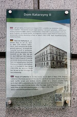 Екатери́на II (Екатери́на Алексе́евна[6]; Екатери́на Вели́кая; урождённая Софи́я Авгу́ста Фредери́ка А́нгальт-Це́рбстская (нем. Sophie Auguste Friederike von Anhalt-Zerbst-Dornburg), в православии Екатерина Алексе́евна; 2 мая 1729, Штеттин — 6 [17] ноября 1796, Санкт-Петербург) — императрица и Самодержица Всероссийская (1762—1796).