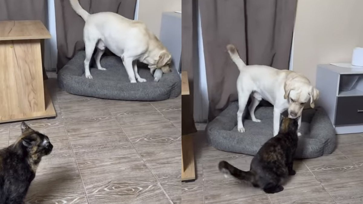 «А ну тихо!»: кошка «попросила» пса убрать пищащую игрушку
