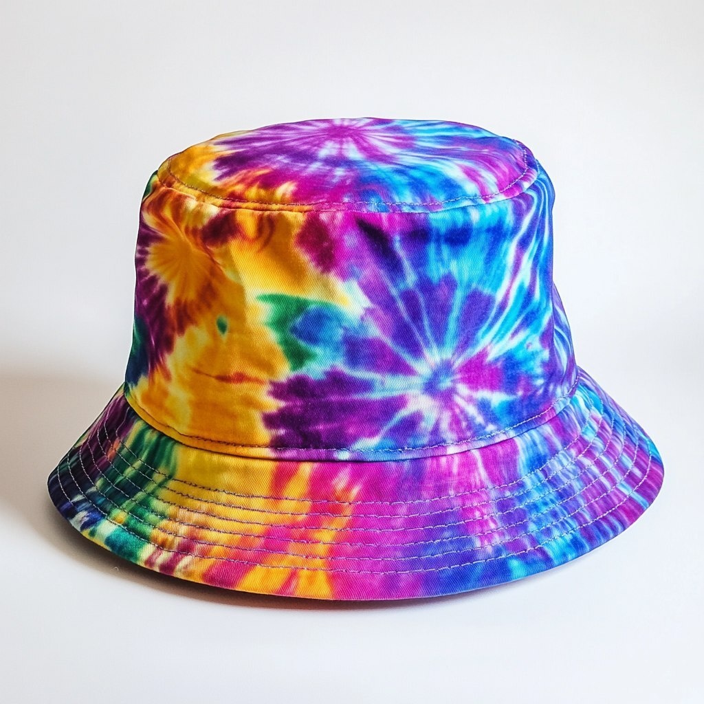 Создано на основе запроса: tie dye bucket hat, 60s retro, logo