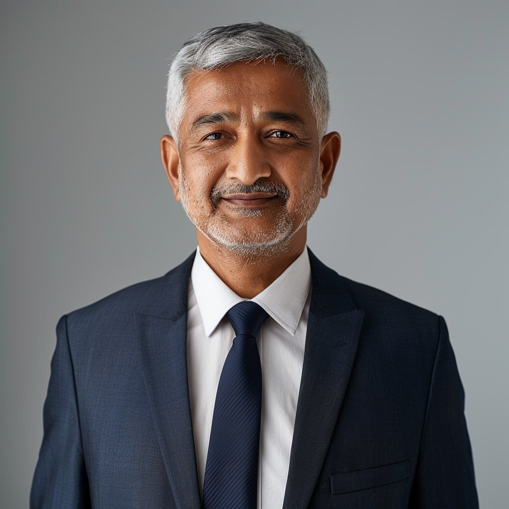 Создано на основе запроса: realistic close-up portrait of an Indian male in his 60s, confident and warm expression, wearing a formal navy blue business suit and tie, short salt and pepper hair, clean-shaven, full face and shoulders in frame, soft lighting, neutral background, executive headshot style, straight posture, shot on Canon EOS R5, 85mm lens, f/1.8