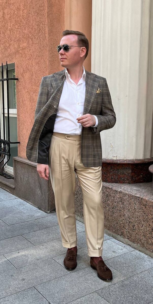 Образ «брюки плюс ремень» является традиционным сочетанием в представлении большинства мужчин. А как насчёт брюк без ремня? Подобный стилевой приём не только элегантен, но и более практичен: не создает ограничений при движении, а также позволяет избежать дискомфорта в области талии и живота. Вернемся к эстетитике. Брюки с боковыми регуляторами (adjusters) помогают обойти визуальное горизонтальное деление образа линией ремня. Это особенно заметно при использовании светлой рубашки, как в моем случае. Зачем на брюках вообще нужны защипы? Во многом это - дань традиции, ведь в прошлом большинство брюк имели такую деталь. Но это также добавляет больше комфорта и свободы в движении, дает возможность разместить руки в карманах. На современных моделях делают в основном одинарные или двойные защипы. Наличие на брюках защипов или боковых регуляторов всегда отсылает нас к сарториальной культуре индивидуального пошива. Хотя подобные элементы могут быть и на качественных готовых изделиях.