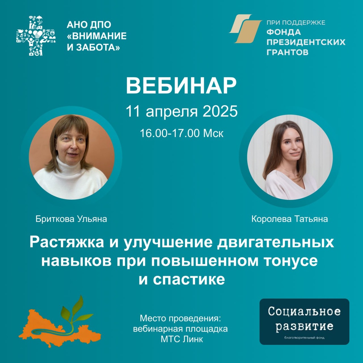 Новости на этом не заканчиваются! 🔥Приглашаем вас на вебинар «Растяжка и улучшение двигательных навыков при повышенном тонусе и спастике» Дата и время: Пятница, 11 апреля 2025 г., 16.00-17.00 по московскому времени. Место проведения: вебинарная площадка МТС Линк Спикеры: Бриткова Ульяна – тренер по уходу, инструктор-методист по лечебной физкультуре, специалист по постуральному менеджменту, президент БФ «Детство Оренбуржья», г. Оренбург Королева Татьяна – тренер по уходу, член правления БФ «Социальное развитие», руководитель Службы родственной помощи, г. Архангельск. Повышаем эффективность домашней реабилитации! Вебинар посвящен техникам растяжки для снижения мышечного тонуса и улучшения движения. Разберем безопасные методы выполнения упражнений. А именно: узнаем, как подготовиться к растяжке и как начать ее использовать в безопасно в домашних условиях. На вебинаре вы познакомитесь с рядом упражнений на растяжку, которую сможете повторить со своим близким, за которым вы ухаживаете.