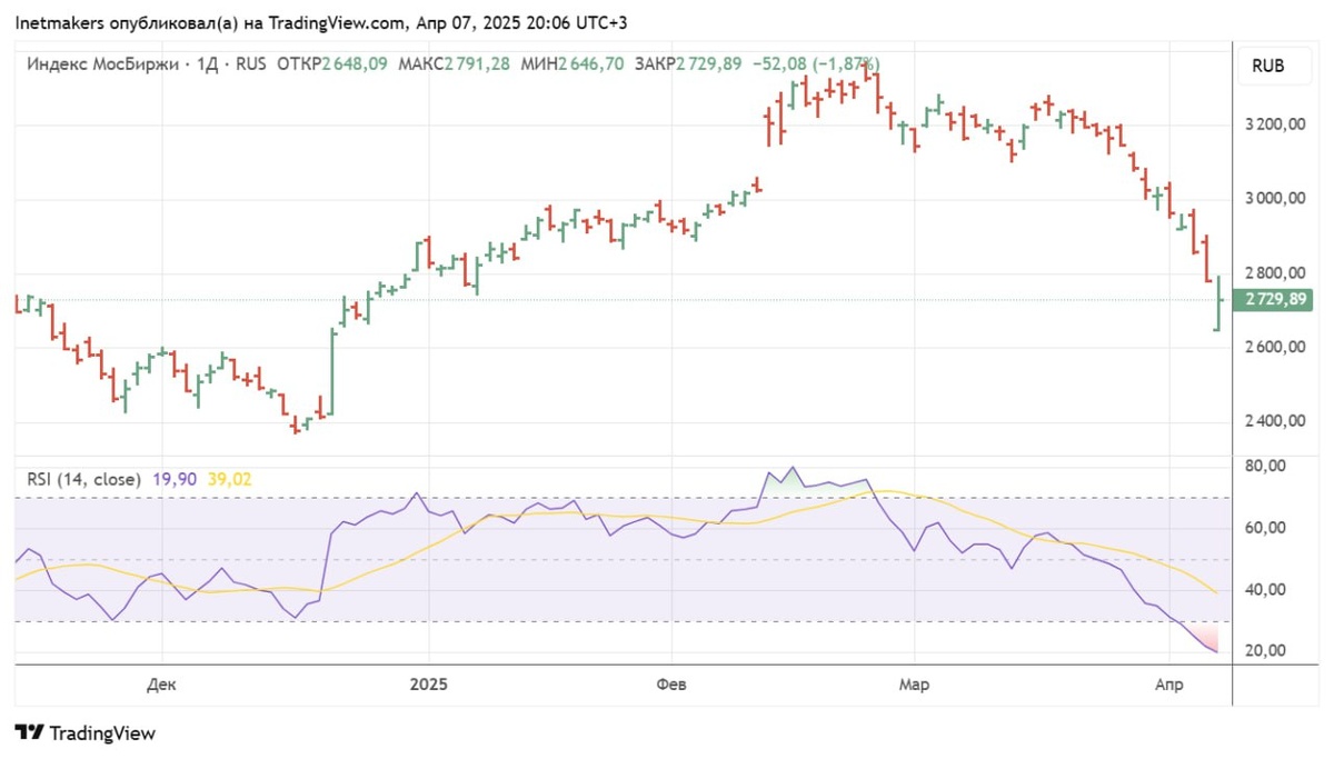 ❗️7 апреля российский фондовый рынок продолжил движение вниз, индекс МосБиржи упал на 1,87% до уровня 2729,89