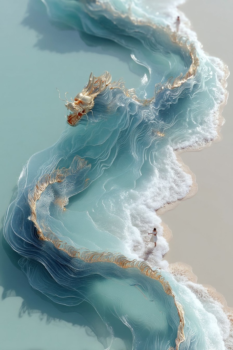 Создано на основе запроса: aerial wide angel zoom, oceanic goddess of aquarius water bends waves to morph dragon, hydraformed water ripple
