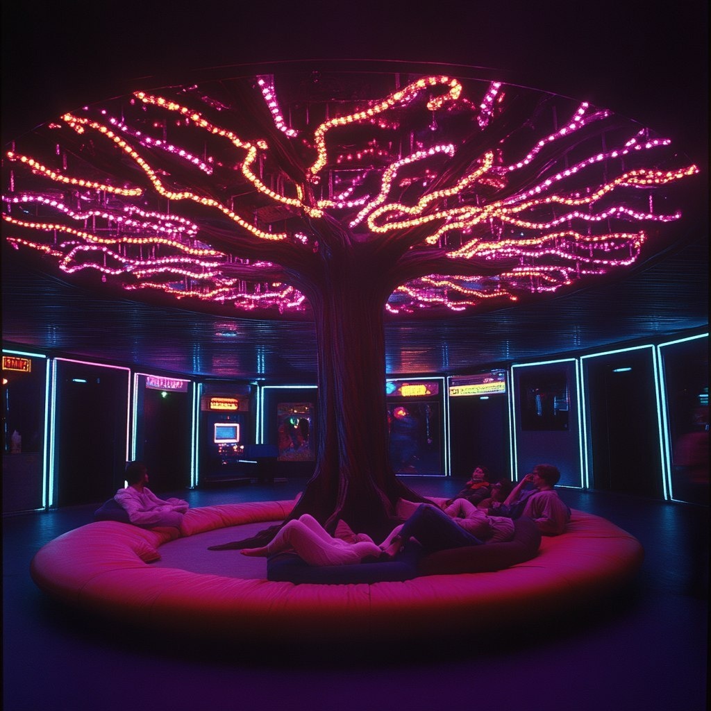 Создано на основе запроса: In a fairground attraction. A cylindrical room, 6 meters in diameter, 4 meters high. In the center a floor-to-ceiling artificial tree with neon lights and marquee lights. The ceiling consists of branches of the artificial tree with neon lights and marquee lights. The floor is a slowly rotating disk on which visitors lie on comfortable beanbags. In the walls of the room, 6 evenly spaced door openings lead to further fairground attractions. --- Автоперевод: В ярмарке. Как тебе изображение? 🤔 https://dzen.ru/id/65c0c65c86e4f837c27b24d7 #ИИ #AI #нейросеть #midjourney #art