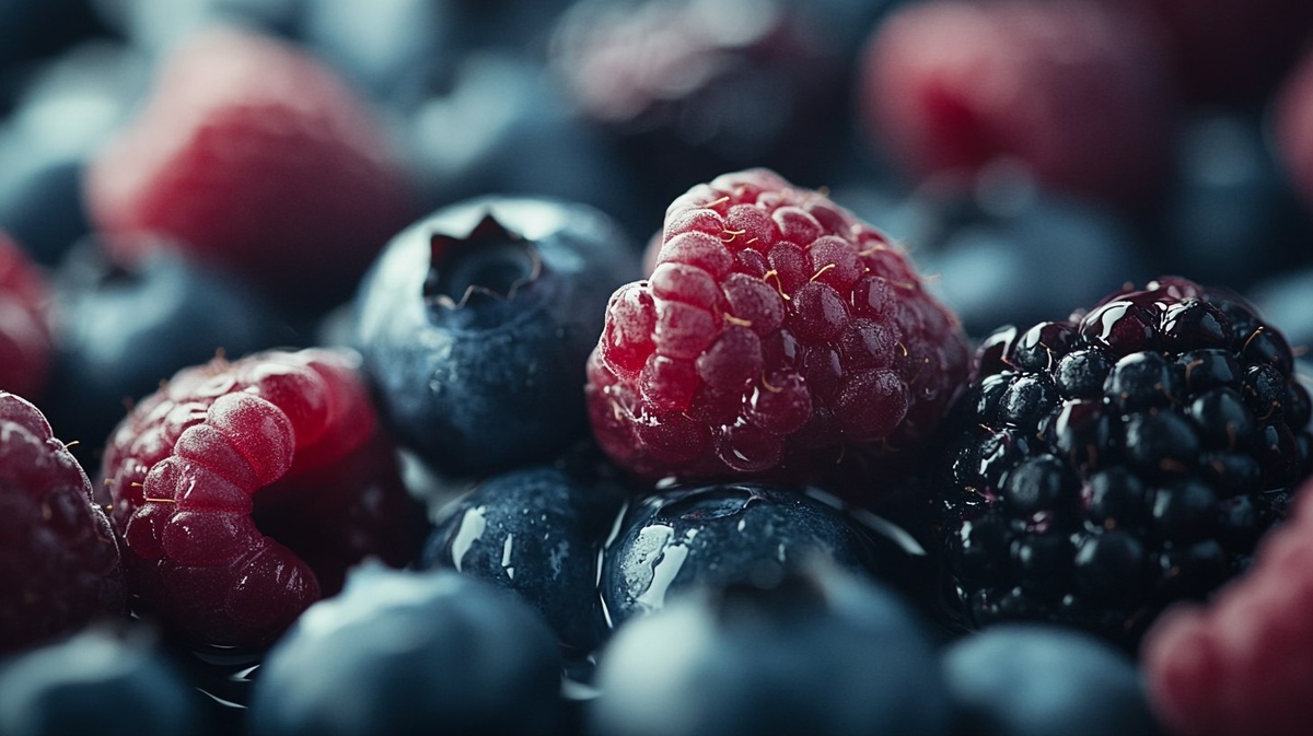 Создано на основе запроса: Close-up of blueberries, raspberries, and blackberries, highlighting their rich texture and health properties