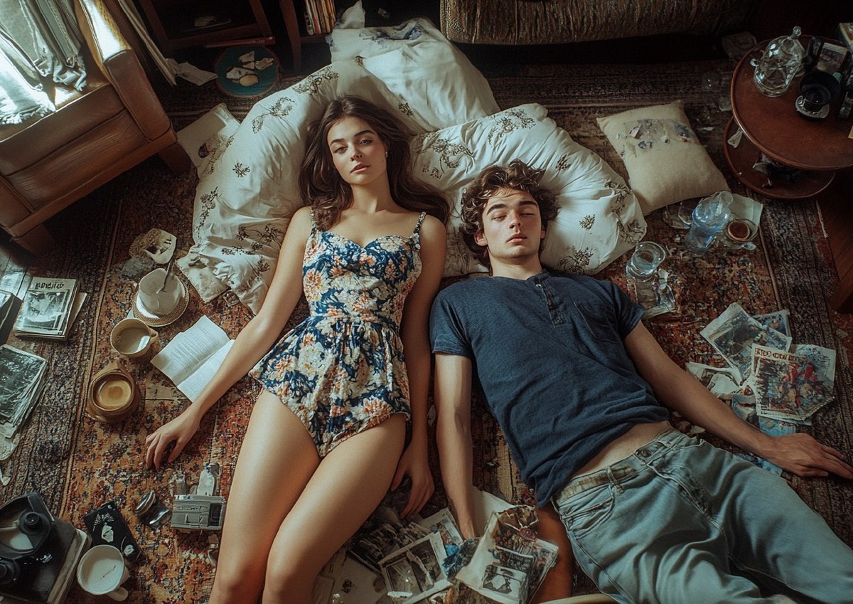 Создано на основе запроса: A photograph of young woman and a young man. The elegant woman is lying on the floor in her living room, surrounded by scattered and shoes, books, magazines, ashtrays, glasses, coffee cups, a messy couch with numerous pillows, a beautiful short dress, and a retro atmosphere. The image was taken from above using a Hasselblad camera, capturing a full-body shot with a hyper-realistic, cinematic style. The lighting and angle create a cinematic effect, and the wide lens and depth of field highlight the intricate details and detailed skin texture, all in natural colors. Near her, a young man is also lying in a dramatic, humorous pose