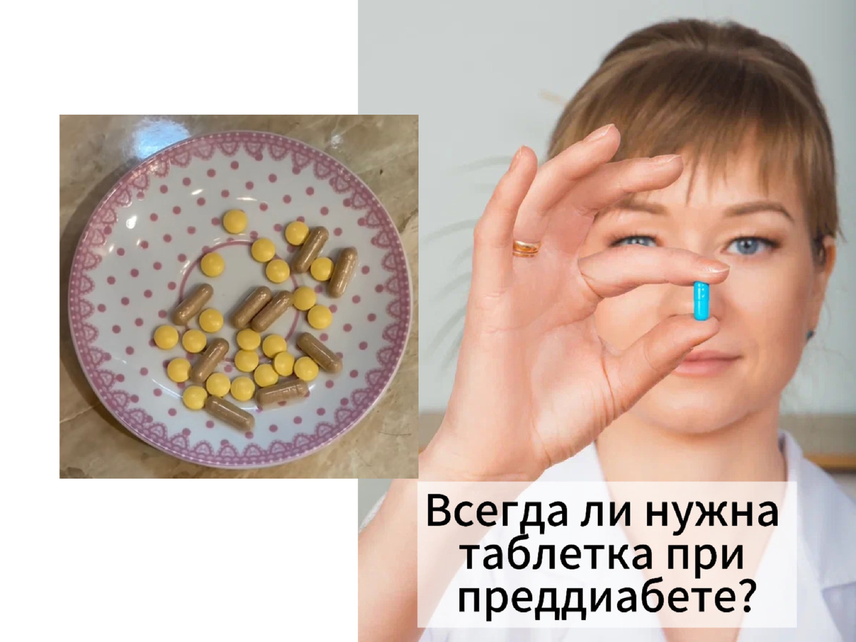 Кратко: таблетка при преддиабете возможна, но не обязательна. Почему так? В большинстве случаев причина начальных нарушений углеводного обмена кроется в избыточной массе тела и нарушении чувствительности к собственному инсулину в связи с этим. Высокомотивированные и ответственные люди могут вполне справиться с этим с помощью ограничения быстроусваиваемых углеводов (смотри про гликемический индекс) и физической нагрузки. Снижение массы тела в таких условиях также помогает добиться устойчивых результатов. Если же попытки снижения глюкозы без препаратов не помогли, тогда они назначаются в помощь. Метформин, например, снижает риск развития сахарного диабета при нарушении толерантности к углеводам (преддиабет). Также индивидуально могут назначаться препараты из других групп, если есть для этого показания: 0жирение, хроническая болезнь почек, сердечная недостаточность. Реально ли справиться питанием и физической нагрузкой с начальным повышением глюкозы крови? Поделитесь в комментария