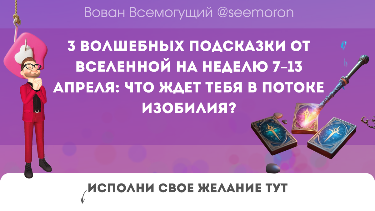 Привет, моя звёздочка! Готова? Потому что с 7 апреля начинается неделя, где магия будет прятаться в деталях, а Вселенная шептать в ухо: "Ты готова к переменам?". Главное — услышать и использовать это время по максимуму! — Утренние часы — золото! Если давно хотела что-то начать, вставь это в свой план на утро. В это время будут рождаться гениальные идеи и решения. — Во второй половине дня — притормози. Вместо спешки — чашка чая, музыка или прогулка. Баланс между «делать» и «быть» даст тебе крутейший результат. — На работе — действуй чётко, не ведись на манипуляции и сплетни. Доверяй себе. - В любви все расцветает. Хочешь тепла и близости? Говори об этом честно. Это неделя открытого сердца и смелых признаний. «Я выбираю спокойствие. Я выбираю себя. Я — магнит для всего светлого!» Ну а если хочешь больше таких волшебных прогнозов, ритуалов и магических фишек — обязательно залетай в мой Телеграм-чат! Там мы не просто читаем карты, а творим реальность с юмором, теплом и Симороном! Волшебны