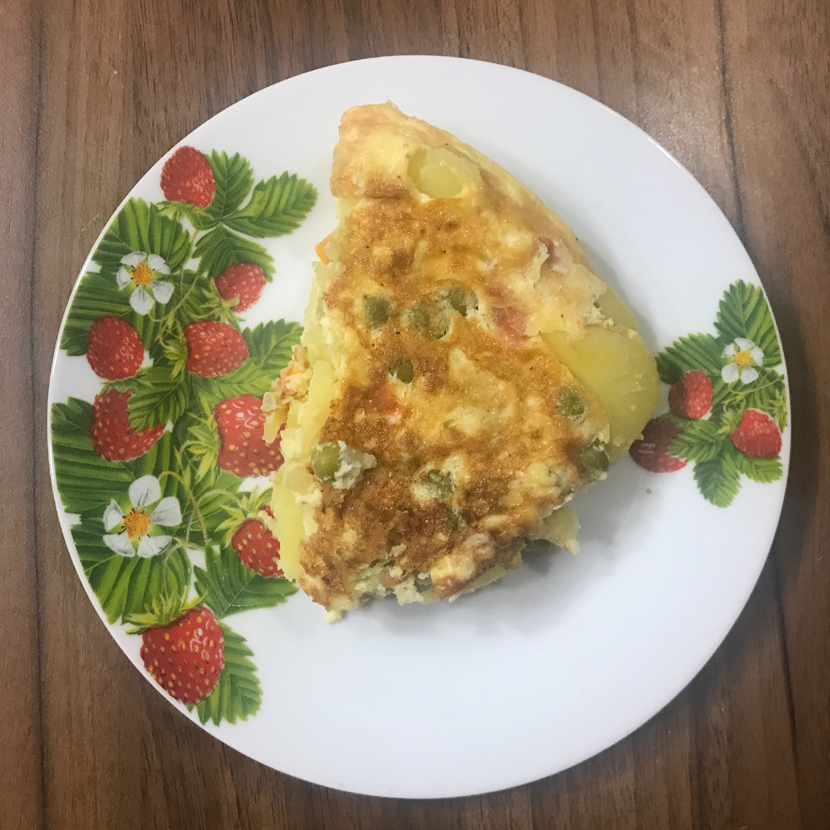 Соль по вкусу 2. Почистить лук, разрезать на половинку и мелко порубить. 3. Острым ножом нарезать помидоры. 4. Влить 2 столовые ложки оливкового масла в сковородку. Разогреть на среднем огне. 5. Добавить картофель и обжарить его в течение 5 минут, постоянно помешивая. 6. Добавить лук и хорошо перемешать. Накрыть сковородку крышкой и уменьшить огонь. Периодически помешивать. 7. Яйца разбить в большую миску и взбить вилкой, так чтобы смешать желтки и белки. 8. Добавить соль и перец. 9. Когда картофель и лук будут готовы, добавить их в миску с яйцами. 10. Добавить помидоры и горошек. 11. Добавить оставшуюся ложку оливкового масла в сковородку и разогреть на среднем огне, приблизительно 1 минуту. 12. Влить смесь яиц и овощей в сковородку. Уменьшить огонь. Готовить на самом слабом огне 15 минут. 13. Когда почти вся жидкость на поверхности омлета исп
