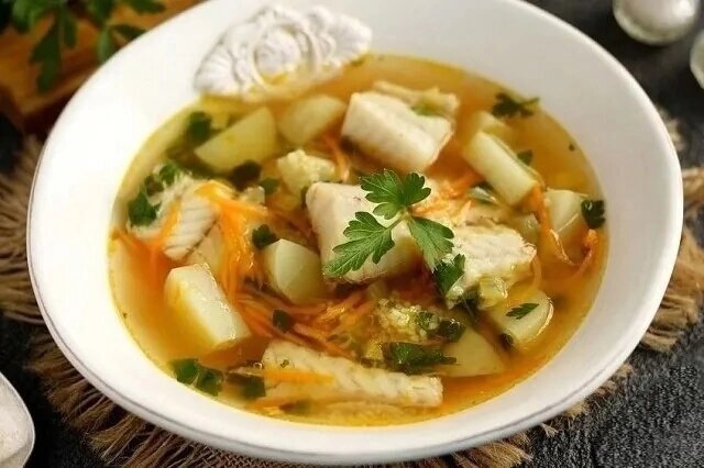 РЫБНЫЙ СУПЧИК ИЗ МИНТАЯ - Минтай 400 г - Лук репчатый 40 г - Морковь 1 шт. - Картофель 300 г - Лук зеленый 1 ветк. - Томатный соус 3 ст. л. - Лавровый лист 1 шт. - Петрушка 2 ветк. - Универсальная приправа 1 ст. л. - Соль и перец по вкусу - Масло растительное 1 ст. л. - Кускус 4 ст. л. - Вода 2 л. В данном случае указано количество для приготовления супа в кастрюле 2,5 л. Картофель, лук и морковь почистите. После этого помойте данные овощи вместе зеленью; Нарежьте рыбу крупными кусками, залейте холодной водой и поставьте на плиту. После закипания варите на тихом огне 15 минут; Выловите вареного минтая на тарелку, очистите от костей. Филе поломайте на кубики; Картофель нарежьте удобными ломтями. Загрузите нарезку в рыбный бульон. Варите минут 10; Разогрейте в сковороде немного рафинированного постного масла, Выложите нарезанный мелким кубиком репчатый лук и натертую морковь. Обжарьте пару минут, до мягкости; Переложите морковь с луком в суп. До
