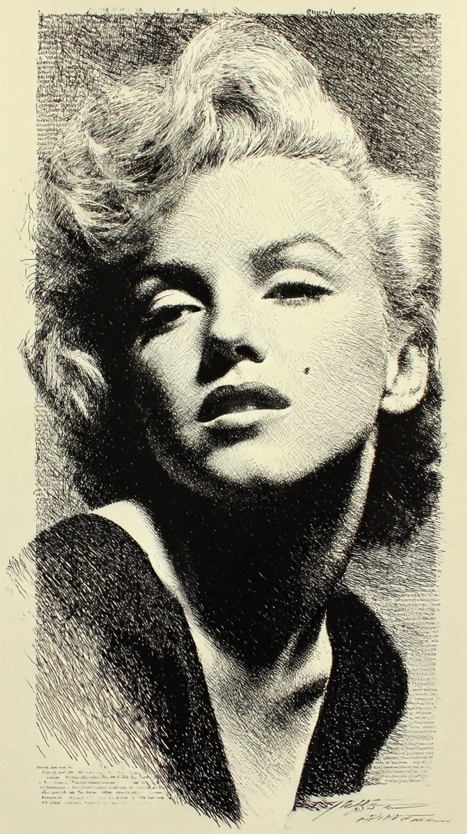 Создано на основе запроса: Stippled, dot shaded portrait of Marilyn Monroe --- Автоперевод: Охваченная, точка затененная портрет Мэрилин Монро Отлично вышло? 🤔 https://dzen.ru/id/65c0c65c86e4f837c27b24d7 #ИИ #AI #нейросеть #midjourney #art