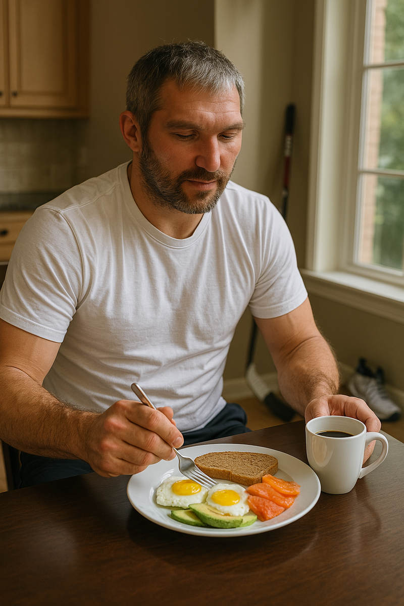 Когда я впервые увидела список того, что ест Александр Овечкин на завтрак — честно, удивилась. Никаких модных смузи, порошков, детокс-напитков! Всё просто, по-домашнему. И при этом — максимум пользы для энергии, мышц и гормонов. Он много лет в НХЛ, играет по 60 матчей за сезон, перелёты, тренировки, возраст — почти 40! А на завтрак — как у обычного мужчины: яйца, каша, рыба, авокадо. Но дело не в продуктах — а в том, как он их сочетает и когда ест 😌 По разным интервью и наблюдениям врачей команды, его типичный завтрак выглядит так: – 2–3 яйца (варёные или в виде омлета),