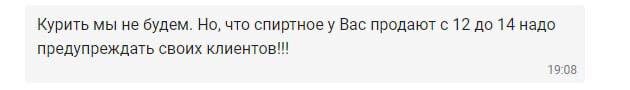 О наболевшем из переписки с гостями. А вы знали, что в Вологде в будние дни алкоголь продают только с 12:00 до 14:00? Наш губернатор в Вологодской области ввел запреты на продажу алкоголя. Его можно купить только в выходные или в ресторанах. Гости города об этом не знают и вот такое сообщение прилетело. Рассуждаем в рабочем чате - как следует поступать? Стоит ли предупреждать гостей до приезда в Вологду о таком факте? Да, ведь это забота о гостях. Нет, ведь мы против того, чтобы в квартирах распивали спиртные напитки. Как бы вы поступили?