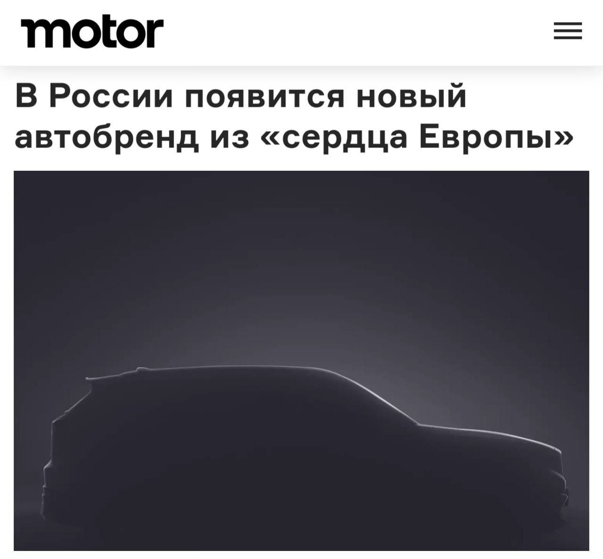 В Россию заходит новый автобренд из «сердца Европы» — но выглядит он очень знакомо. В сети появился тизер загадочного бренда, премьера которого назначена на 14 апреля. На затемнённом изображении — кроссовер, по силуэту подозрительно похожий на белорусский Belgee X70 (он же Geely Atlas Pro). Официальных подробностей пока нет, но, возможно, речь идёт о ребрендинге уже знакомых моделей. https://motor.ru/news/heart-of-europe-07-04-2025.htm