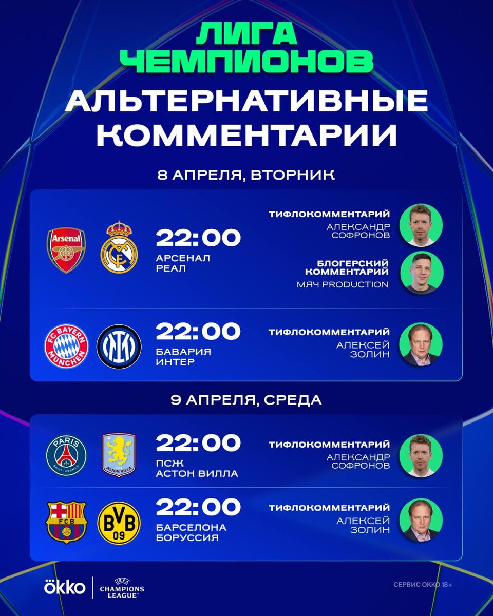А послушать тифлокомментарии Алексея Золина можно на двух встречах: «Бавария» — «Интер» и «Барселона» — «Боруссия» Д 🔝