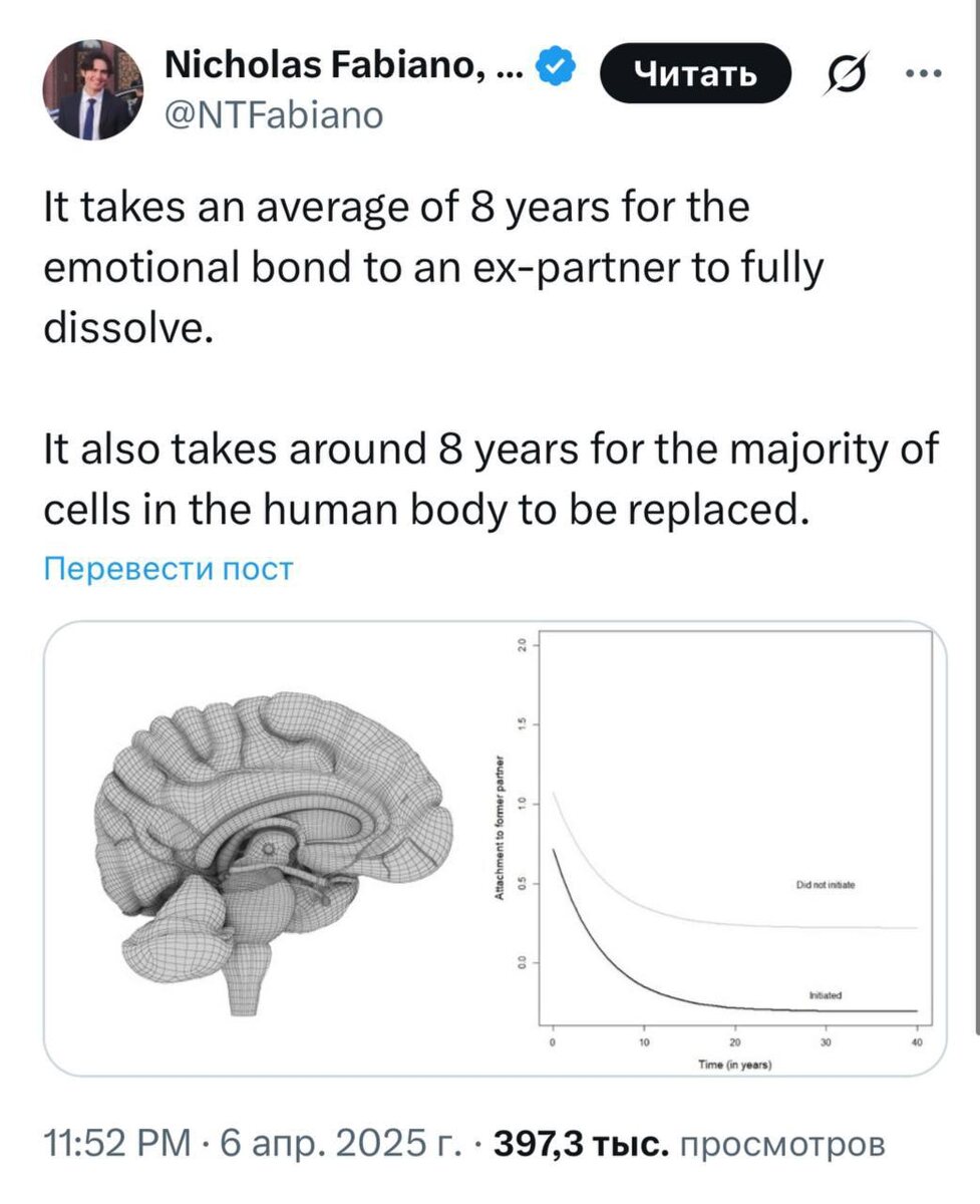 Чтобы полностью забыть бывших нужно около 8 лет — ученые За этот период времени клетки в организме человека почти полностью обновляются. Таким образом обновляется и эмоциональная память. Биологическая связь стирается. 👉🏻Новости №1 в Ростове 💌Прислать новость/фото