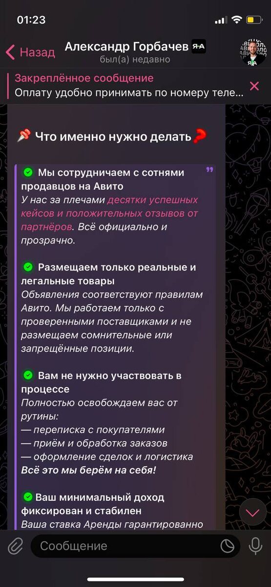 Бесплатный сыр только в мышеловке🧀 В продолжение предыдущего поста. https://dzen.ru/id/64d9b8fb65ccd60f0bbbdf7b - мой единственный официальный канал в Telegram. @amgtrafficmore - мой ник. Других каналов у меня нет. В личку я никому не пишу. Деньги в долг не прошу, инвестициями не занимаюсь, схемы по легкому заработку не предлагаю. Чтобы предостеречь вас, объясняю схему мошенников, которой со мной поделилась одна из пострадавших👇 Они берут «в аренду» аккаунты Авито для совершенно легальной деятельности. И предлагают взамен скромное вознаграждение - всего 1700р в день + 10% с каждой продажи! А это в среднем около 5000р. 1700р в день + 5000р с каждой продажи с вашего аккаунта просто так! И вам ничего не нужно делать! Сказка. И да, люди, к сожалению, в это верят🤦♂️ Что происходит на самом деле: мошенники выставляют с вашего аккаунта фейковые товары, ведут потенциальных покупателей в telegram (а там уже готов аккаунт с вашим именем и фото), берут деньги за товар и пропадают. По