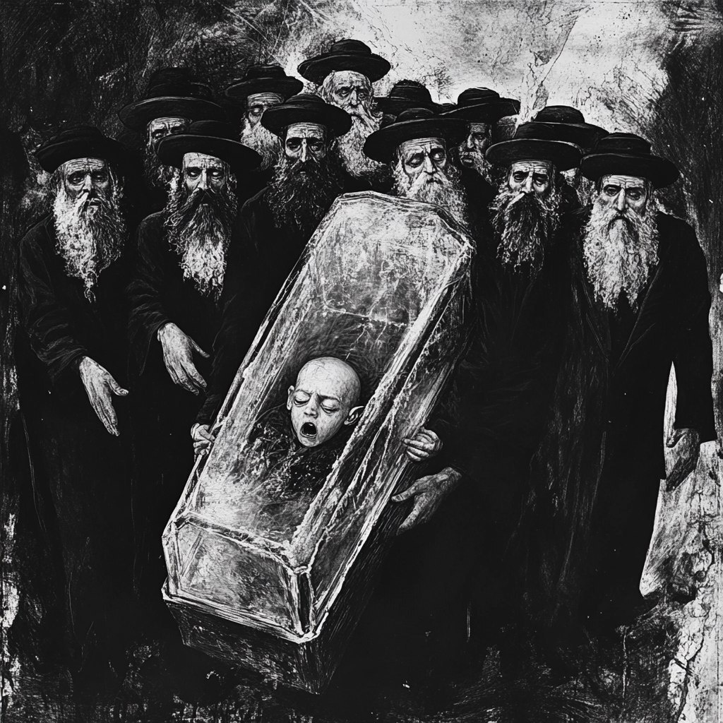 Создано на основе запроса: in a balck and white ancient parchment lithiograph, baby Lucifer the devil lays dead inside of a glass coffin that is being carried by 10 hasidic men --- Автоперевод: В черно -белой древней пергаментной литографии ребенок Люцифер Дьявол лежит мертвым в стеклянном гробу, который несет 10 хасидских мужчин Как тебе картинка? 🤔 https://dzen.ru/id/65c0c65c86e4f837c27b24d7 #ИИ #AI #нейросеть #midjourney #art