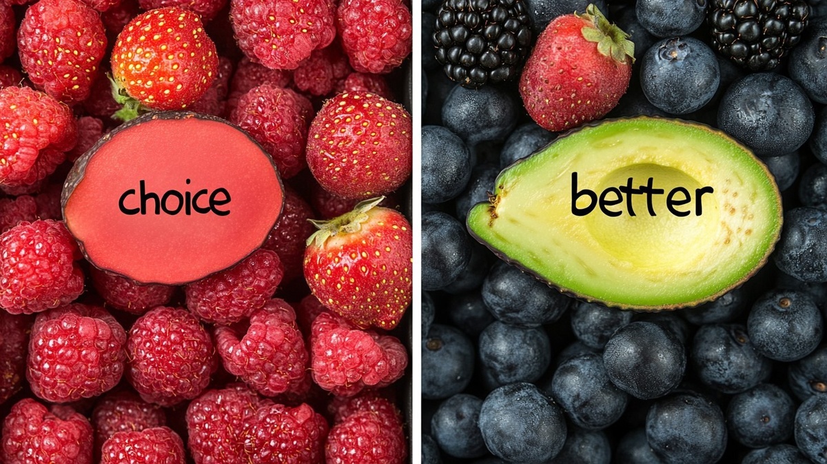 Создано на основе запроса: A split screen showing "risky" fruits on one side with a subtle 'avoid' symbol, and "better choice" fruits (berries, avocado) on the other side with a 'go' symbol.