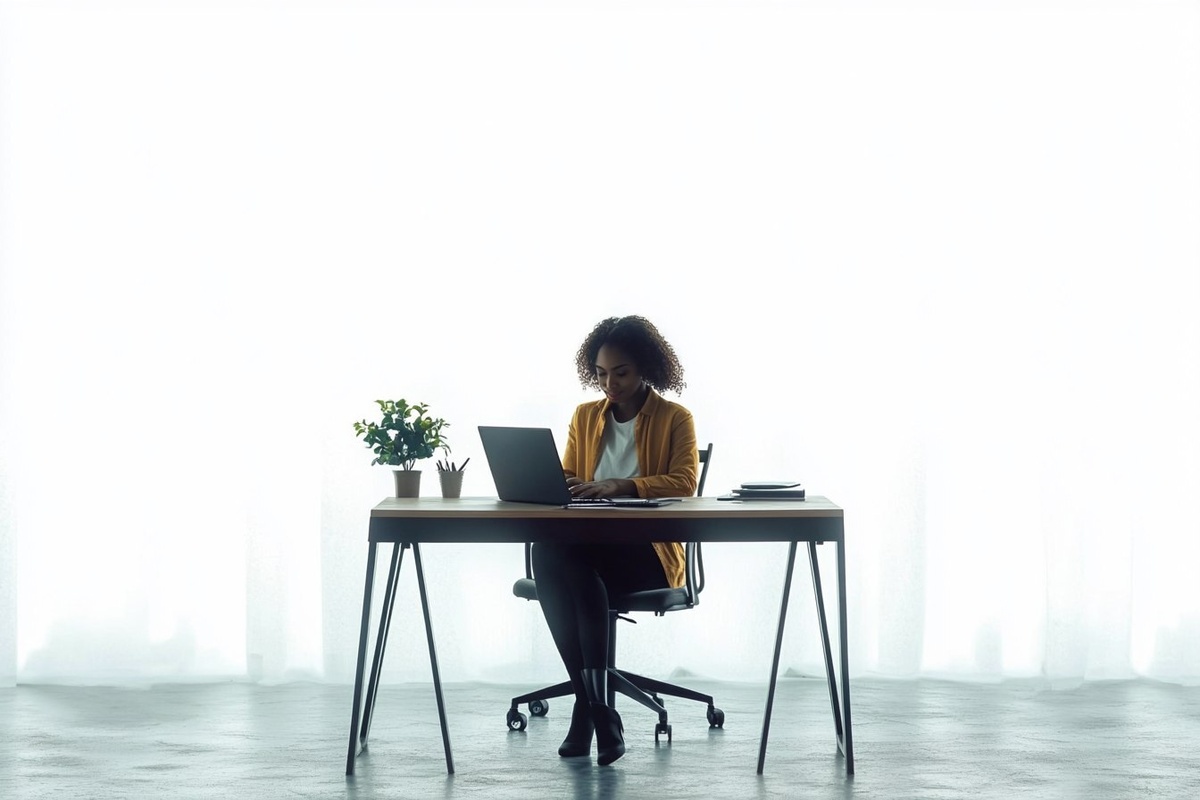 Создано на основе запроса: wide shot of a woman sitting at a desk working on a laptop white background