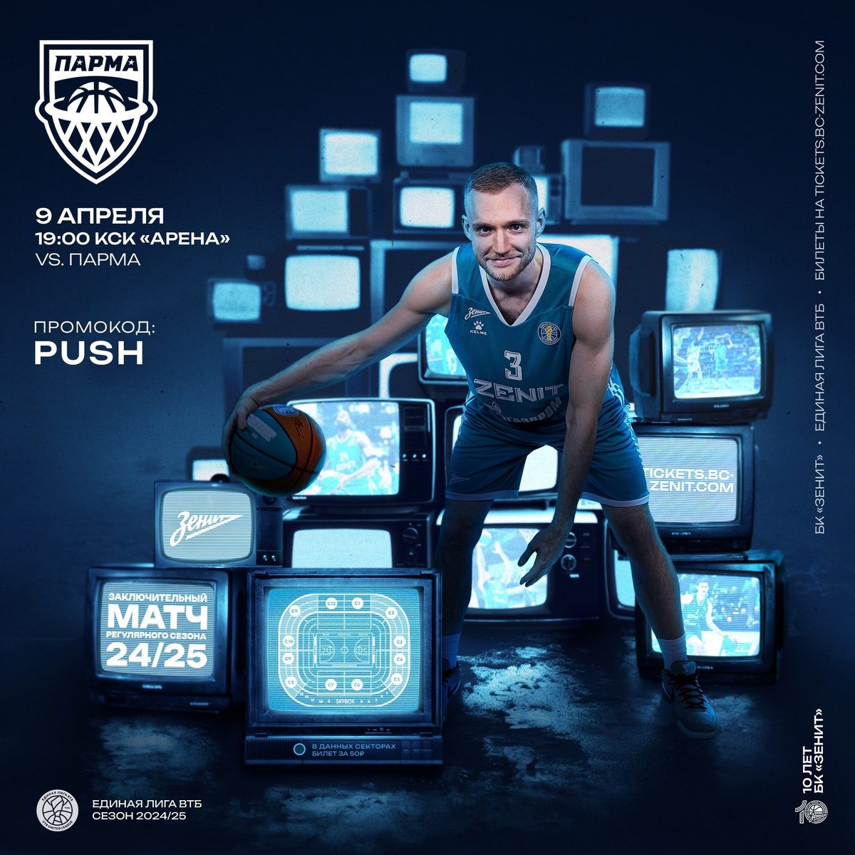 🏀ЗЕНИТ vs ПАРМА 🗓 9 АПРЕЛЯ в 19.00 👍Билеты от 50 рублей!!! 📍КСК «АРЕНА» Давай вместе смотреть по настоящему, а не по ящику! Ждём всех на совместный просмотр крайнего домашнего матча в этом регулярном чемпионате уже в эту среду в 19.00 на КСК “Арене”! (Данная скидка действительна на секторы 2, 3, 4, 5, 8, 9, 10, 11) Воспользоваться скидкой можно следующим образом: 🔘Заходим на сайт 🔘Выбираем место, в ценовом диапазоне от 100 до 800 руб. 🔘Заполняем все обязательные поля 🔘Вводим промокод: PUSH 🔘Переходим к оплате и скачиваем билет Контакты технической поддержки билетного сайта: support@bc-zenit.com ДО ВСТРЕЧИ НА МАТЧЕ💙
