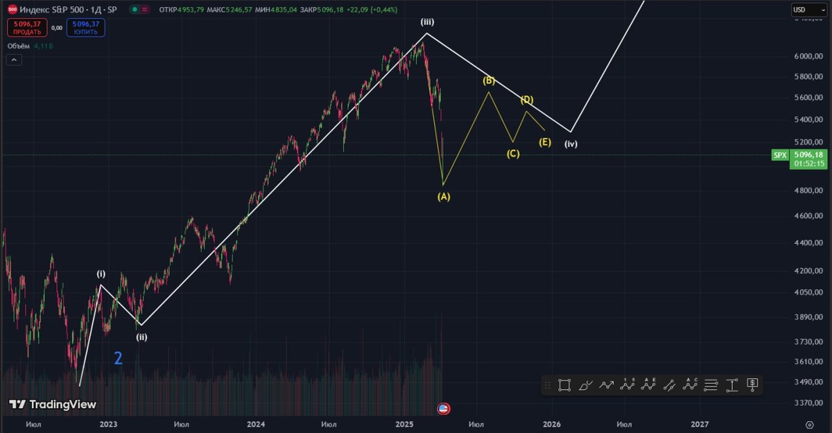SnP 500 Тут так же как и с XRP пришлось корректировать разметку Коррекция оказалась намного амплитуднее, чем я ожидал, однако, для меня основной план с треугольником ABCDE остается основным