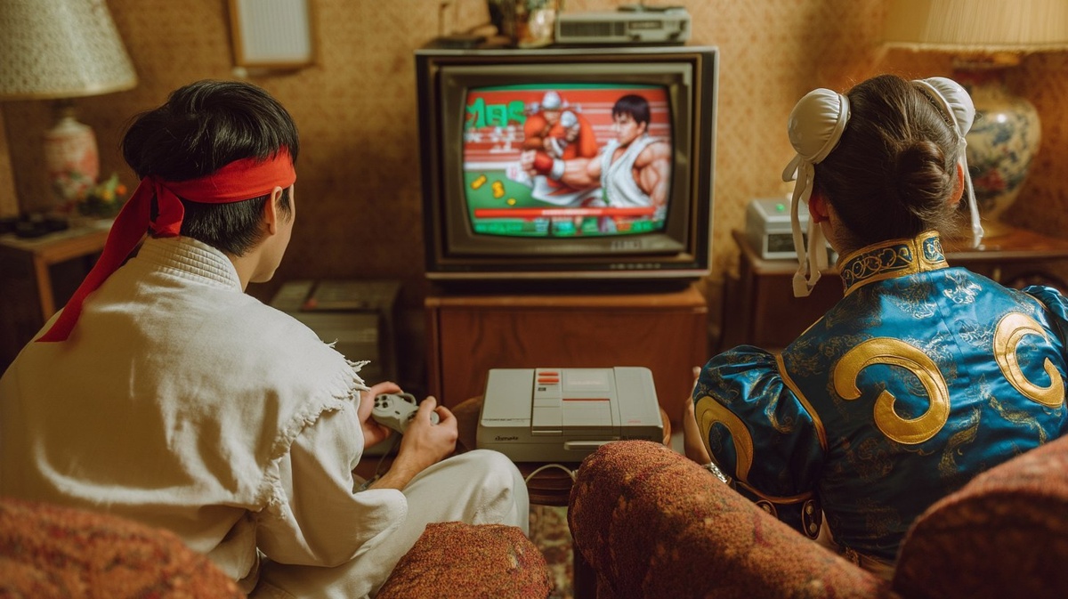 Создано на основе запроса: a CRT screen displaying an intense fighting scene from RYU against Chun Li on Street Fighter 2 game