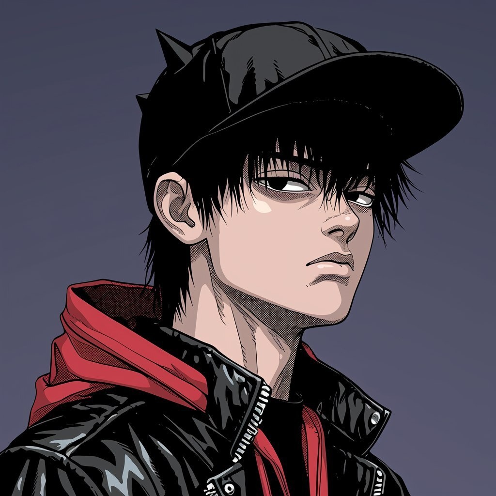Создано на основе запроса: Side profile portrait of a teenage boy in an anime style, Junji Ito horror manga influence, cel-shading, flat design, high contrast, simple shapes and lines, wearing a black leather jacket with silver zippers over a red hoodie, messy dark brown hair with crimson tips, piercing black eyes, solid dark purple background, wearing a black snapback cap and silver aviator sunglasses, small black horns and faint shadowy mist, ultra-detailed ink lines clean grey background --- Автоперевод: Портрет с боковым профилем подростка в стиле аниме, влияния манги ужасов Джунджи Ито, разминках с пелом, плоским дизайном, высоким контрастностью, простыми формами и линиями, в черной кожаной куртке с серебряными молния Красиво выглядит? 🤔 https://dzen.ru/id/65c0c65c86e4f837c27b24d7 #ИИ #AI #нейросеть #midjourney #art