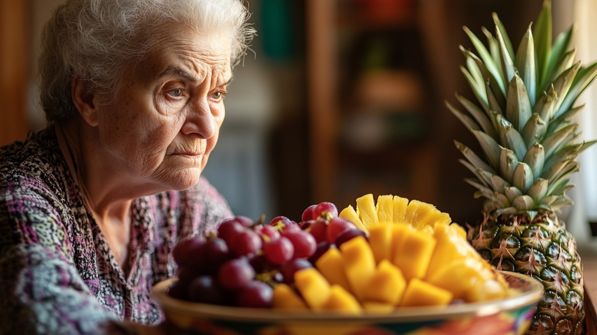 Создано на основе запроса: A senior person looking thoughtfully at a colorful fruit bowl filled with pineapple, grapes, mango, with a