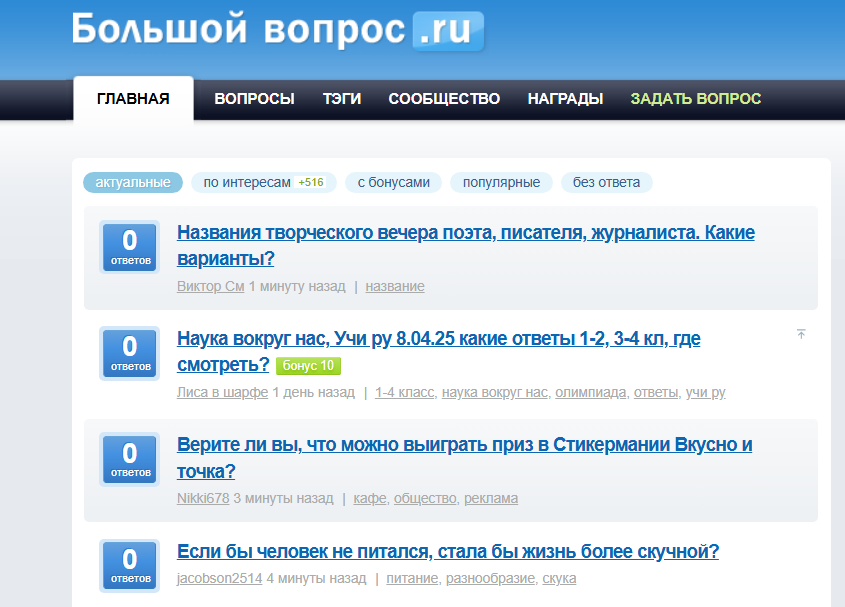 За последние годы я протестировала много сайтов по заработку в интернете. На данный момент лучше всего у меня получается на сайте "Большой вопрос". Доход на нём больше чем на других проектах. А работать на "Большом вопросе" нисколько не труднее, даже легче. На этом проекте нужно отвечать на вопросы и задавать их. Вопросов на сайте очень много, на любые темы. Так что вы обязательно найдёте свой вопрос, на который сможете и захотите ответить. А вопросы время от времени появляются у каждого человека. Иногда действительно получаешь дельный ответ на свой вопрос. На сайте много соревновательных и игровых моментов. Это делает работу на проекте интересной. Так же на "Большом вопросе" узнаёшь много нового. Мне нравится на нём работать, но, к сожалению, много времени "Большому вопросу" уделять не могу. На данный момент у меня много других забот и проблем. Не смотря на то, что я работаю на сайте не в полную силу, тем не менее набегает от 20 до 50 кредитов. Кредиты обмениваются на деньги в зави