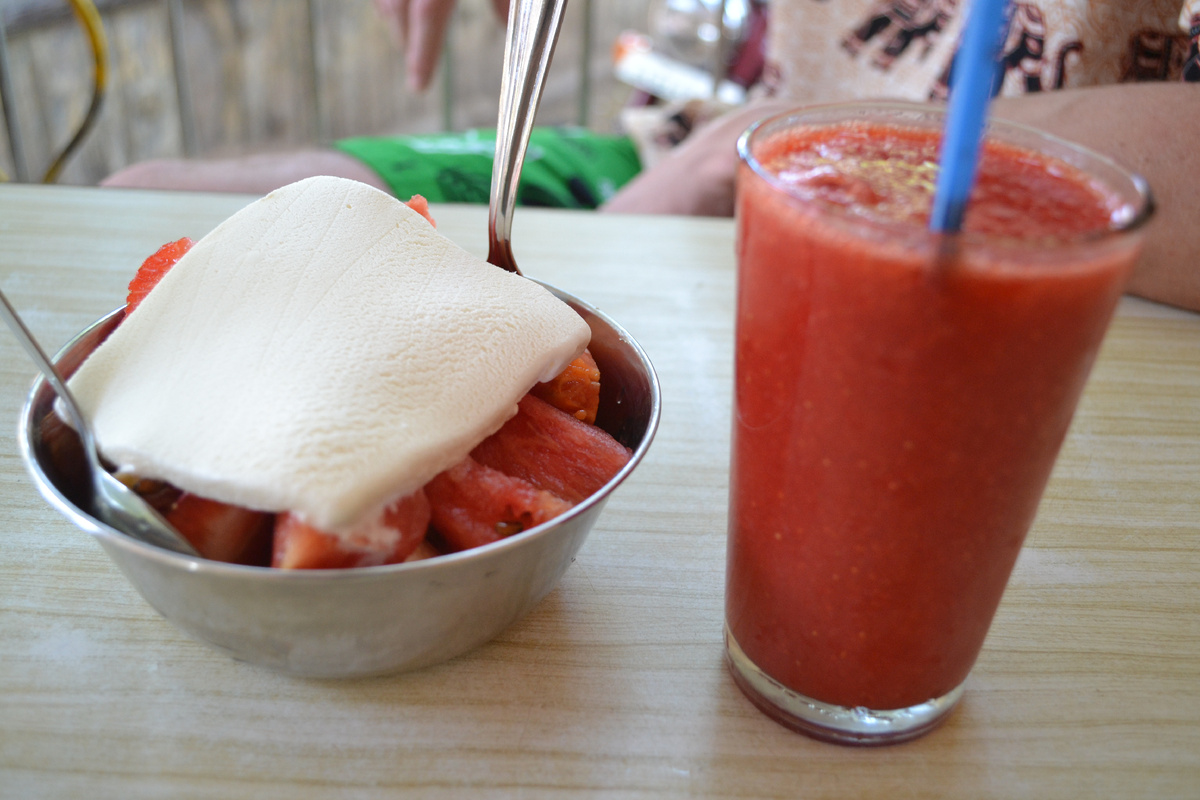 На следующее утро мы поехали в деревушку Чапора.Там мы хотели посмотреть одноимённый форт,зайти в Джус-центр и посмотреть на пляж Вагатор! Джус-центр оказался очень классным!Во-первых там было разнообразие свежих соков,от арбуза до свеклы и ещё мороженое с фруктами!Мороженого нам положили огромный кусок,а соков мы выпили из-за жары несколько стаканов!Да ещё и цена там была в два раза ниже,чем в шеках в Калангуте! Потом по дорожке среди джунглей,мы пошли на пляж Чапора! Этот пляж не совсем пригоден для купания,так как там много камней,но мы всё же выкупались!Но виды,конечно,живописные!Песочек тут такой твёрдый,утоптанный и много коров. Также здесь много рыбацких лодок,а местные парни хотят пообщаться и опять наделать стопятьсот фотографий!Шеков на берегу тоже намного меньше,но они есть,как и магазинчики с одеждой и отели!И ещё тут очень красивые длинные тоненькие пальмы,как фейерверки! Индийцы часто купаются прямо в одежде,обычно они сидят просто у берега и мажутся в песке.Ка