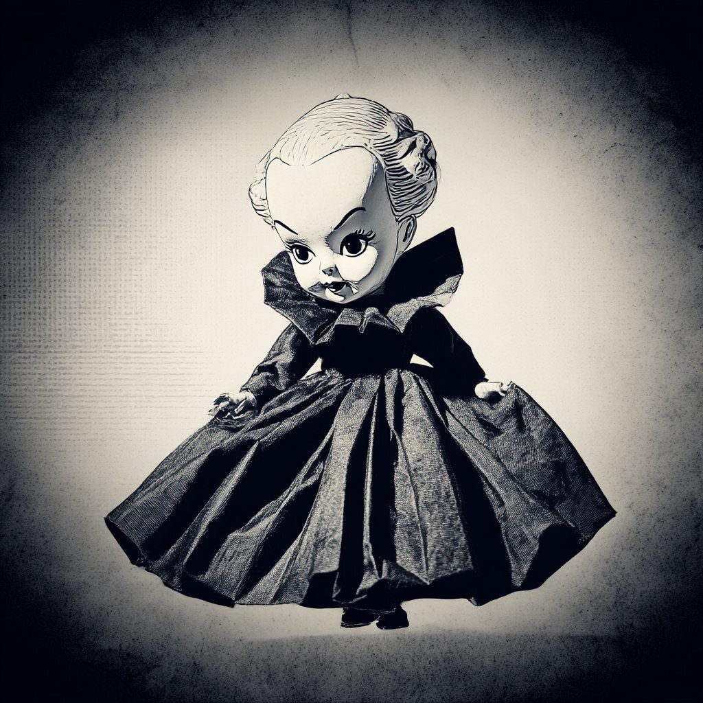 Создано на основе запроса: Villainette kewpie doll , large head little body swathed in ominous taffeta, illustrated comic style