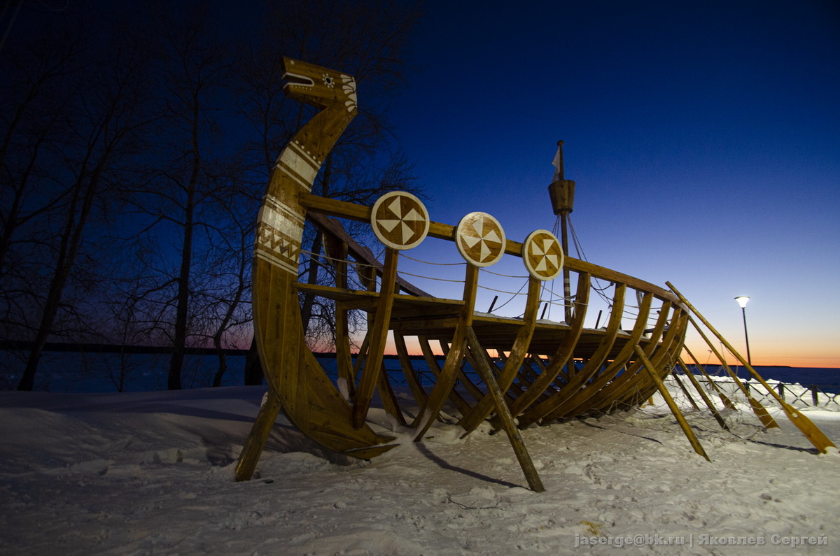 На онежской набережной надежно встало деревянное судно. Кто назовет это обобщенно лодьей, кто-то увидит в нем ушкуй, а некоторым почудится даже драккар. А вы думаете, что это? Несомненно, новая набережная и новые арт-объекты делают Онегу ярче. Онега и Онежский район в других моих статьях...