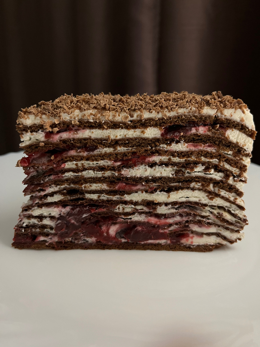 Начинка: Шоколадные коржи: Крем: Готовим сначала начинку: вишню выложить в сотейник с толстым дном, залить водой (40г) и засыпать сахар. Немного подогреваем. В это время смешиваем крахмал с оставшейся водой и вливаем в вишню. Доводим до кипения и вливаем ром. Снимаем с огня, накрываем крышкой и даем настояться пока готовим коржи. На водяной бане прогреваем мёд, когда он станет жидким добавляем соду и размешиваем венчиком. Добавляем сливочное масло. В это время взбиваем яйца с сахаром. Добавляем яйца к медовой смеси, помешиваем венчиком и провариваем 1 минуту, снимаем с огня, добавляем ром и просеянную заранее муку с какао. Замешивание тесто, оно не должно прилипать к рукам. Раскатываем примерно 11-14 коржей в зависимости от их толщины. Выпекаем коржи около 3-4 минут, при 200 градусах, внешне они должны посветлеть. Подрезаем нужный размер сразу, пока они не остыли и не стали твердыми. Коржи лучше раскатать заранее и выложить на листы бумаги для выпечки, друг на друга. Так будет по