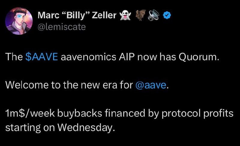 #AAVE одобрило байбэк монет Сообщество #AAVE приняло решение о выкупе собственных токенов (байбэк), что стало важным шагом в обновлении токеномики проекта. В рамках этой инициативы в течение следующих шести месяцев планируется еженедельный выкуп токенов на сумму 1 миллион долларов. Первый байбэк состоится уже в эту среду, и это событие будет служить своего рода экспериментом для #AAVE. Обновление токеномики направлено на улучшение рыночной динамики и создание дополнительной ценности для держателей токенов. Выкуп токенов может способствовать сокращению их предложения на рынке, что в долгосрочной перспективе может положительно сказаться на цене. Однако, на данный момент, несмотря на это позитивное нововведение, монета не смогла отразить изменения на графике цен, что может быть связано с общими рыночными условиями. В случае успешного проведения этого эксперимента, #AAVE планирует продлить программу байбэка. Это может стать сигналом для инвесторов о том, что проект настроен на долгоср