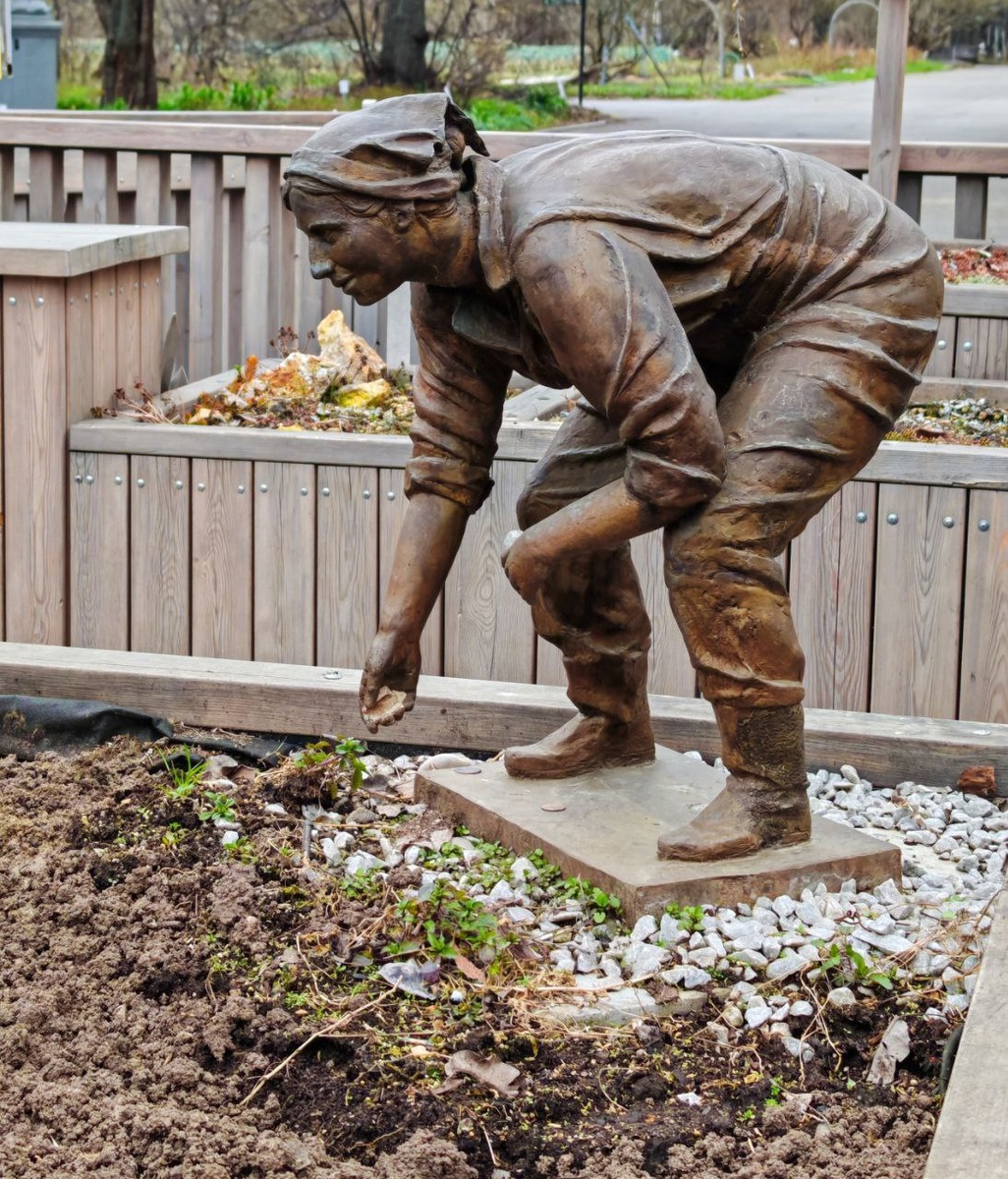 "Садовница" скульптор Камзолкина Е.А., 2021 год. "Посвящается всем садовникам и садовницам, благодаря самоотверженному труду которых существует наш прекрасный сад". Ботанический сад МГУ им. М.В. Ломоносова