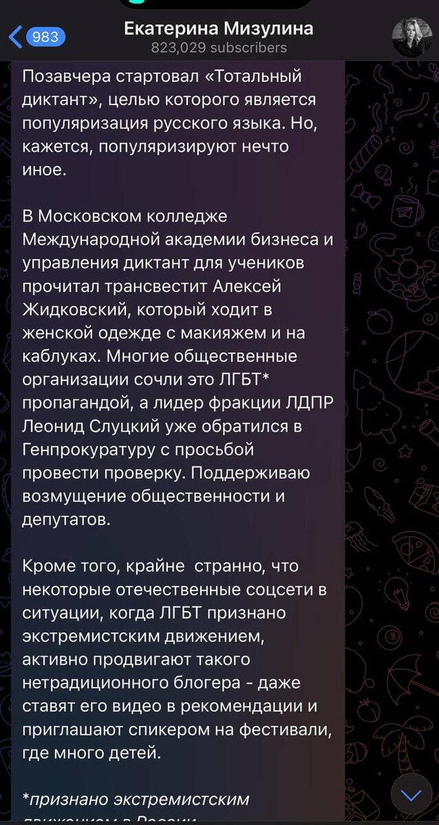 Екатерина Мизулина высказалась о ситуации с Алексеем Жидковским Многие общественные организации сочли это ЛГБТ* пропагандой, а лидер фракции ЛДПР Леонид Слуцкий уже обратился в Генпрокуратуру с просьбой провести проверку. Поддерживаю возмущение общественности и депутатов *Ранее Верховный суд РФ признал «международное движение ЛГБТ» экстремистским и запретил его. Заря | Новости - Подписаться