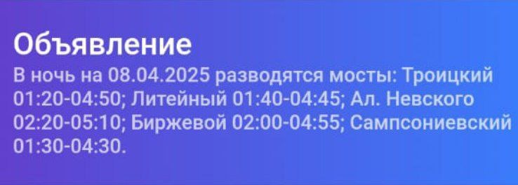 ❗️Этой ночью на вторник 8 апреля разводят 5 мостов: ❌ Троицкий 1:20 - 4:50 ❌ Сампсониевский 1:30 - 4:30 ❌ Литейный 1:40 - 4:45 ❌ Биржевой 2:00 - 4:55 ❌ А.Невского 2:20 - 5:10 👉 Высокий Спрос. Подписаться #курьер #такси #доставка #водитель #яндекс #таксисты