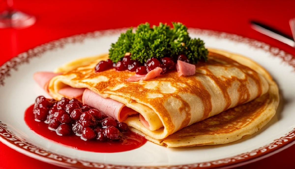 Блинчики с ветчиной и сыром с ягодным вареньем. #нейросеть #цифровоефото #рисунок #цифроваяживопись #арт #артыотнейросетей #DigitalDreamscapes #нейроарт #нейрофото #digitalart #leonardo #шедеврум #aiartwork #иллюстрация #еда #ai #готовимдома #блин #ветчина #варенье
