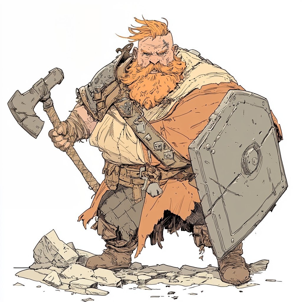 Создано на основе запроса: Fantasy concept illustration, crazied warrior dwarf, heavy spartan armour big axe and big squared shield, blonde blonde red hair and braided beard, brown black ripped cape with runes, octopath traveler style, white dungeon background, high quality, exaggerated fighting pose --- Автоперевод: Фэнтезийная концепция иллюстрация, безумный воин гнок, тяжелая спартанская броня и большой квадратный щит, блондинка с красными волосами и плетеная борода, коричневая черная накидка с рунами, стиль осьминога, белый фон подземелье, высокое качество, преувеличенная боевая поза, поза Хорошо выглядит? 🤔 https://dzen.ru/id/65c0c65c86e4f837c27b24d7 #ИИ #AI #нейросеть #midjourney #art