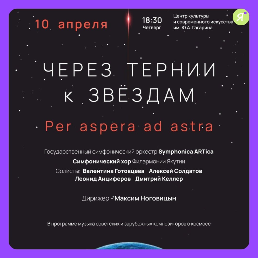 Космическая симфония ко Дню космонавтики #концерты 10 апреля в 18:30 в Центре культуры им. Ю. Гагарина состоится концерт "Через тернии к звёздам". В программе: • Симфонический оркестр Symphonica ARTica (дирижёр — Максим Ноговицын) • Избранные произведения: - "Планеты" Густава Холста - Сюита из "Звёздных войн" Дж. -Увертюра к фильму "Укрощение огня" А. Петрова • Выступление солистов Симфонического хора 🤩10 апреля |18:30 Центр культуры и современного искусства имени Юрия Гагарина 🤩 Касса: ул. Ярославского, 27, оф. 111 🤩 8 (4112) 45-05-98, 47-63-35 Билеты Online Якутия | Подписаться