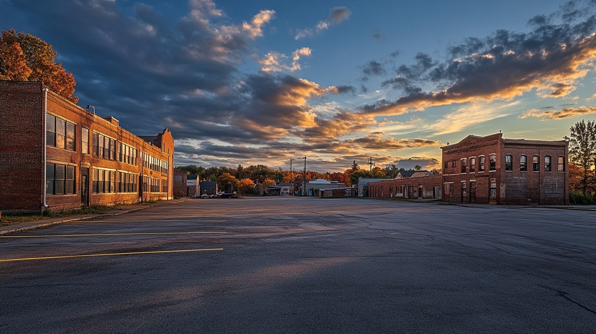Создано на основе запроса: a parking lot with old brick buildings off in the distance. it's a small town and the setting is as dusk. award winning lighting