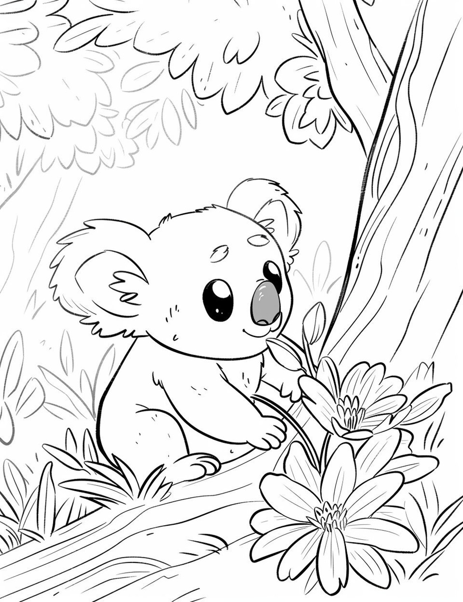 Создано на основе запроса: A simple black-and-white coloring page for toddlers (3 years old) showing a cute cartoon koala waking up in a