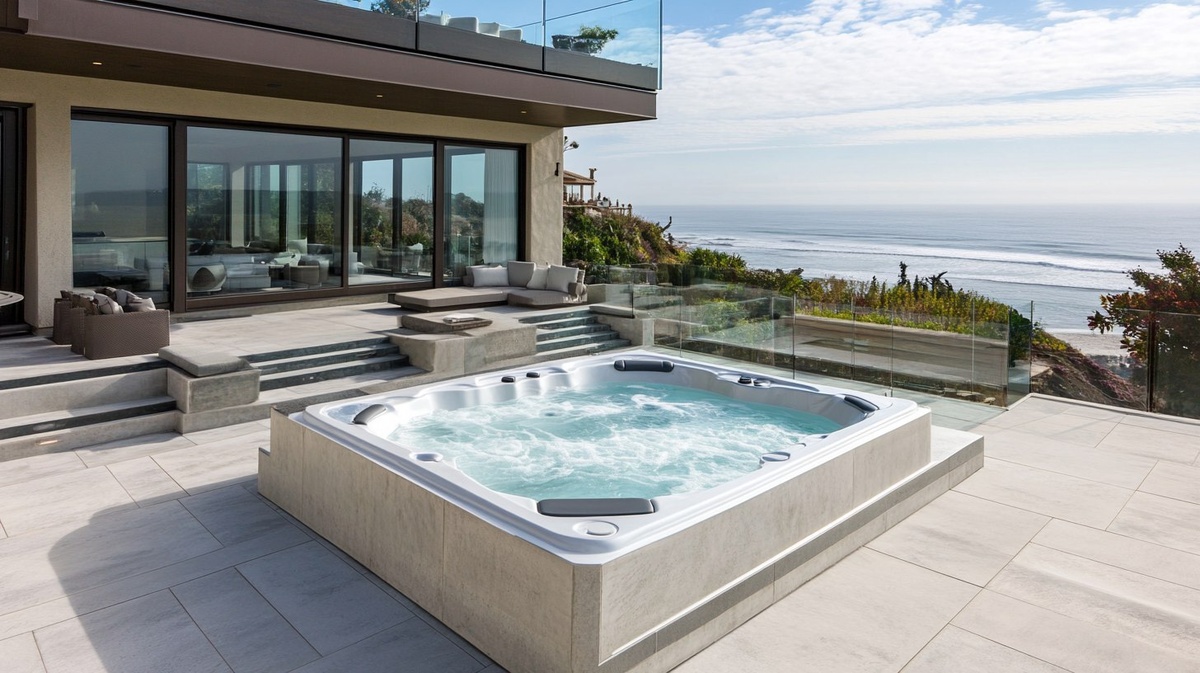 Создано на основе запроса: a luxury coastal residential rooftop with seating areas, a hot tub and an outdoor kitchen area - and glass railings around the perimeter. the home is overlooking the ocean. The floor is made of concrete pavers - and is the focal point of the image