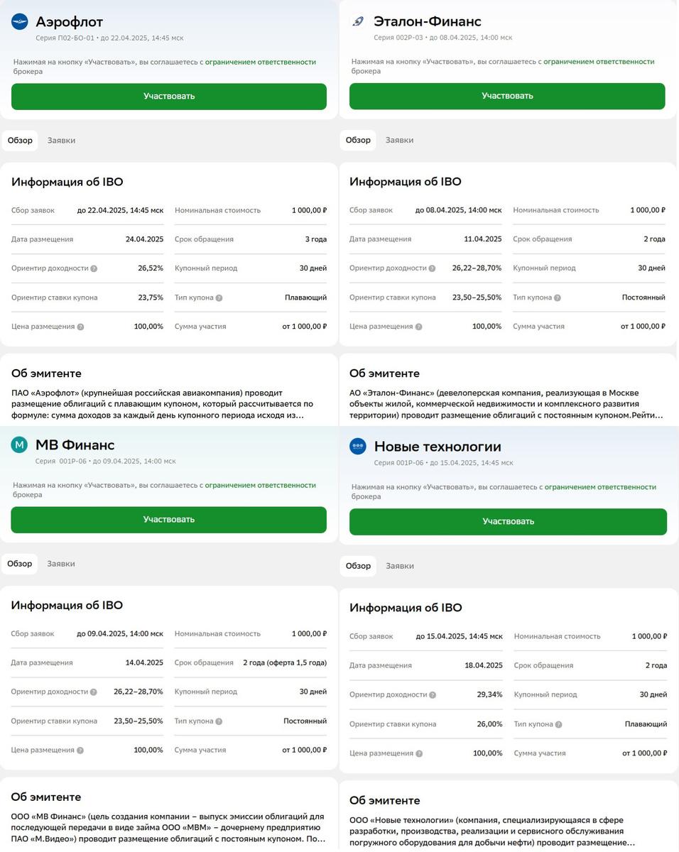 Сегодня по предварительной заявке в наш облигационный портфель вошли две бумаги. Облигации Сэтл Групп-002P-04 (RU000A10B8M0), годовой купонный доход 23,9%, дата погашения 12.03.30. А также облигации Инарктика-002P-03 (RU000A10B8P3), годовой купонный доход КС+3,4%, дата погашения 22.03.28. Завтра ожидаем выход в обращение облигаций ДАРС-Девелопмент-001Р-03 и Селигдар-001P-03 на покупку, которых ранее были поданы заявки. Сегодня подали заявки брокеру на покупку следующих облигаций: Глоракс-001Р-04, ЕвроТранс БО-001Р-07, ЯТЭК-001Р-06, ТЕХНО Лизинг-001Р-07, Эталон-Финанс-002Р-03, МВ Финанс-001Р-06, Новые технологии 001Р-06, Полипласт-П02-БО-04 и Аэрофлот-росс.авиалин.ПАО П02 БО-1. Характеристики облигаций ниже: